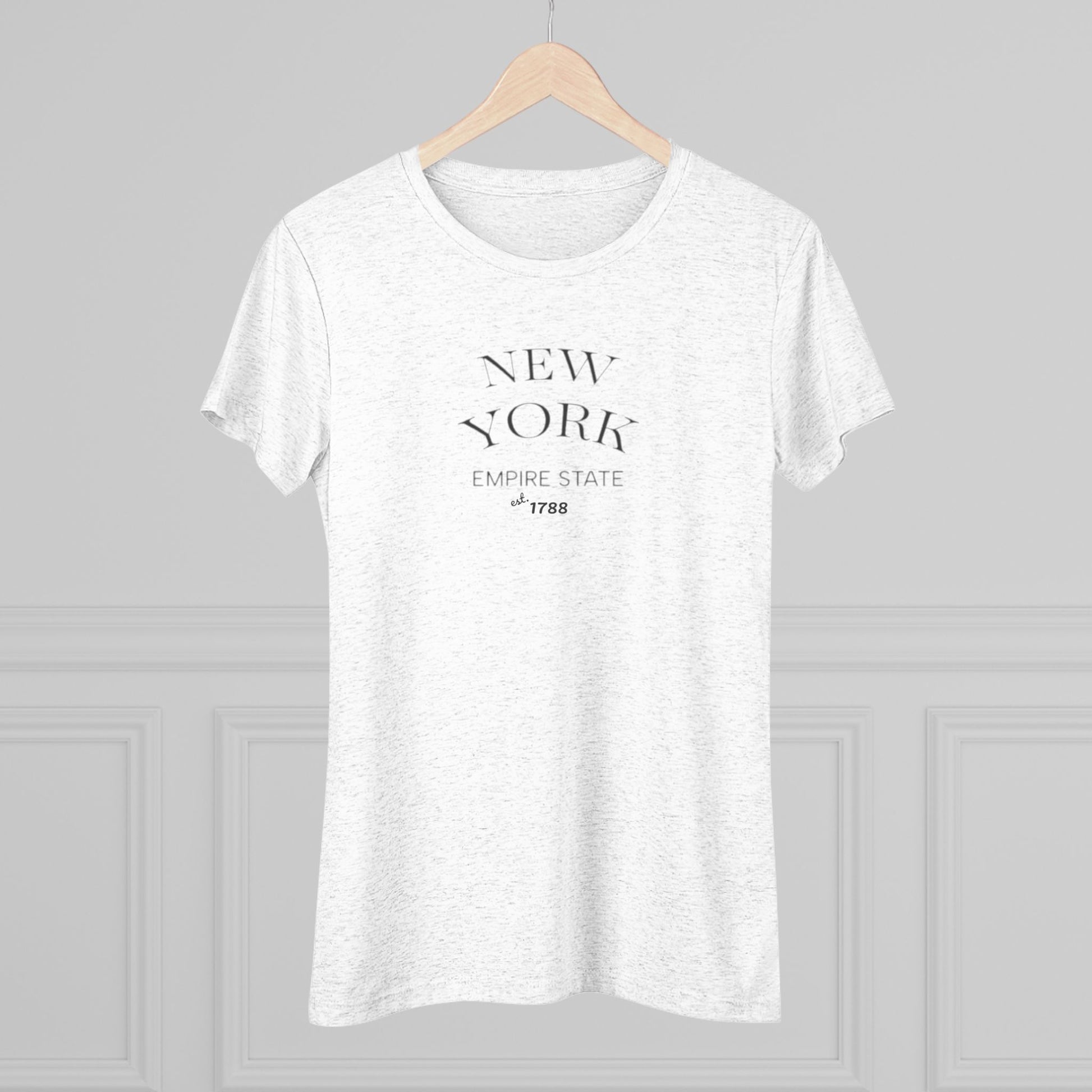 Let your loyalty to the state of New York shine brightly while experiencing ultimate comfort and style with this Women's Triblend Tee. In addition to the state's name, the tee highlights the year that New York became a state in the Union. Designed for the modern woman, this shirt offers a soft, breathable fit that's perfect for casual outings or lounging at home. The lightweight fabric drapes beautifully without compromising durability, and the slim fit makes it an ideal choice for layering or wearing on its own. Perfect for everyday wear, it's a great addition to your wardrobe. Also, enjoy tiny graphic of the state on the back of the shirt. Get the perfect basic Tee with a vintage look.