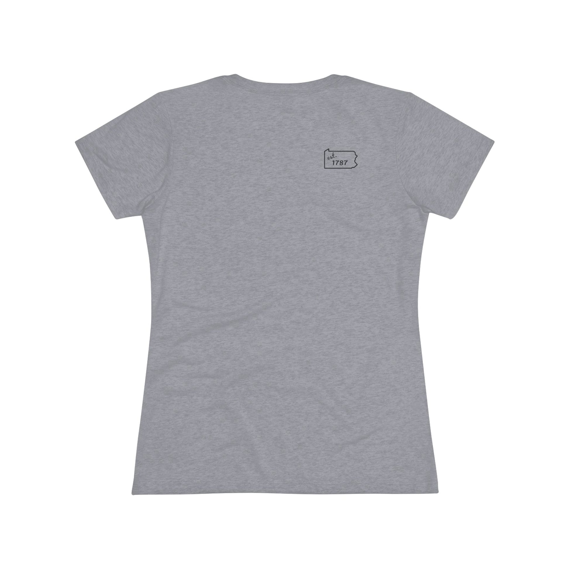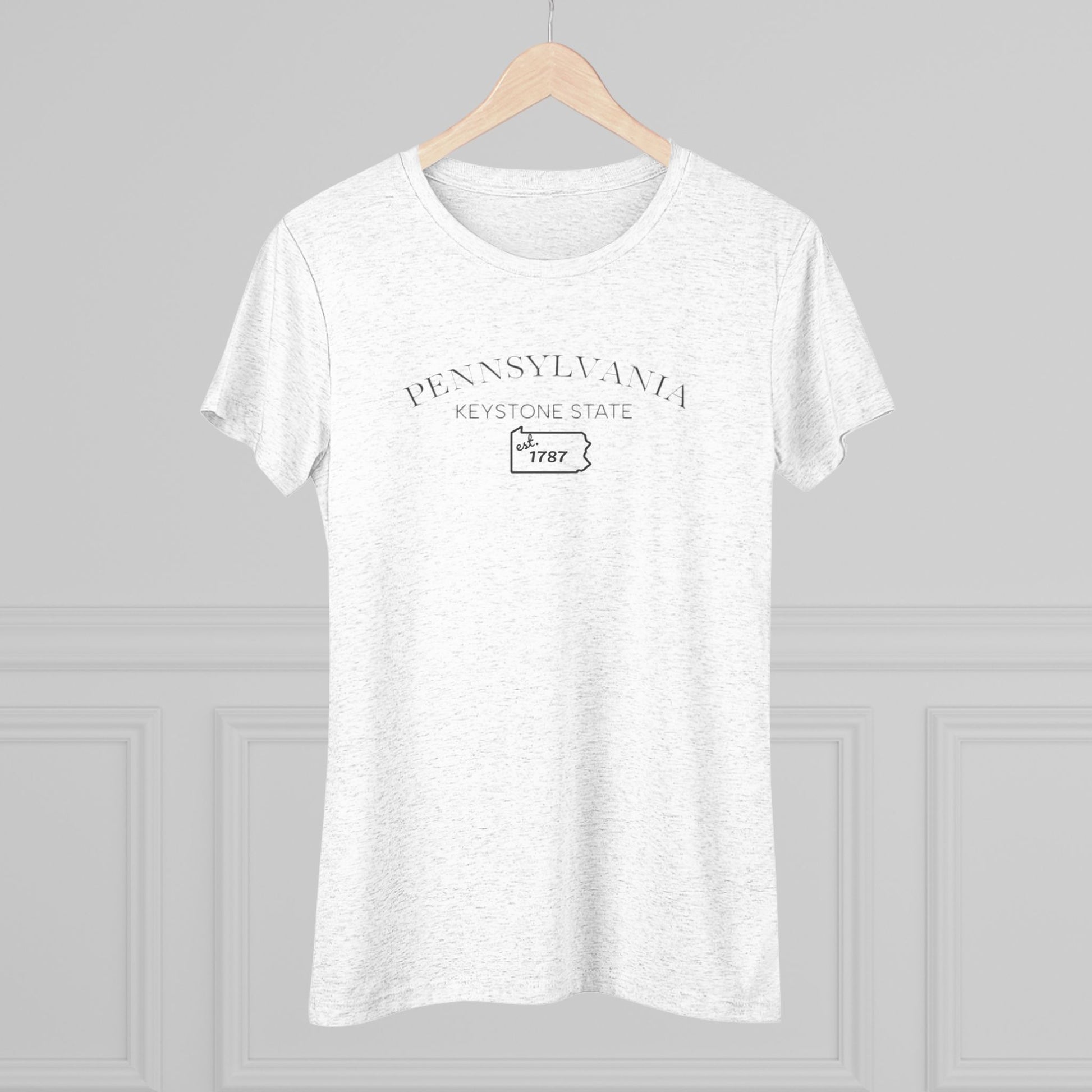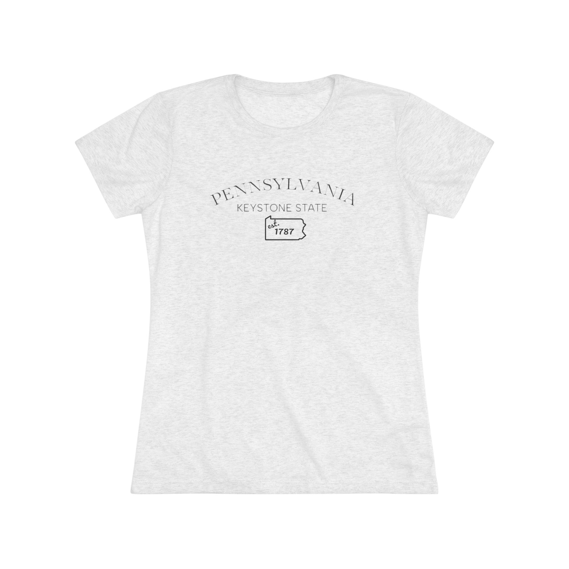 Let your loyalty to the state of Pennsylvania shine brightly while experiencing ultimate comfort and style with this Women's Triblend Tee. In addition to the state's name, the tee highlights the year that Pennsylvania became a state in the Union. Designed for the modern woman, this shirt offers a soft, breathable fit that's perfect for casual outings or lounging at home. The lightweight fabric drapes beautifully without compromising durability, and the slim fit makes it an ideal choice for layering or wearing on its own. Perfect for everyday wear, it's a great addition to your wardrobe. Also, enjoy tiny graphic of the state on the back of the shirt. Get the perfect basic Tee with a vintage look.